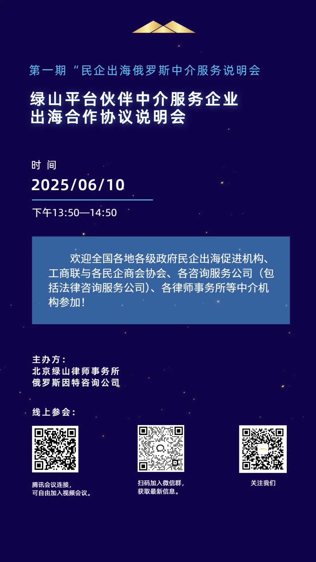 第一阶段(13:50—14:50): 绿山平台伙伴中介服务企业出海合作说明会