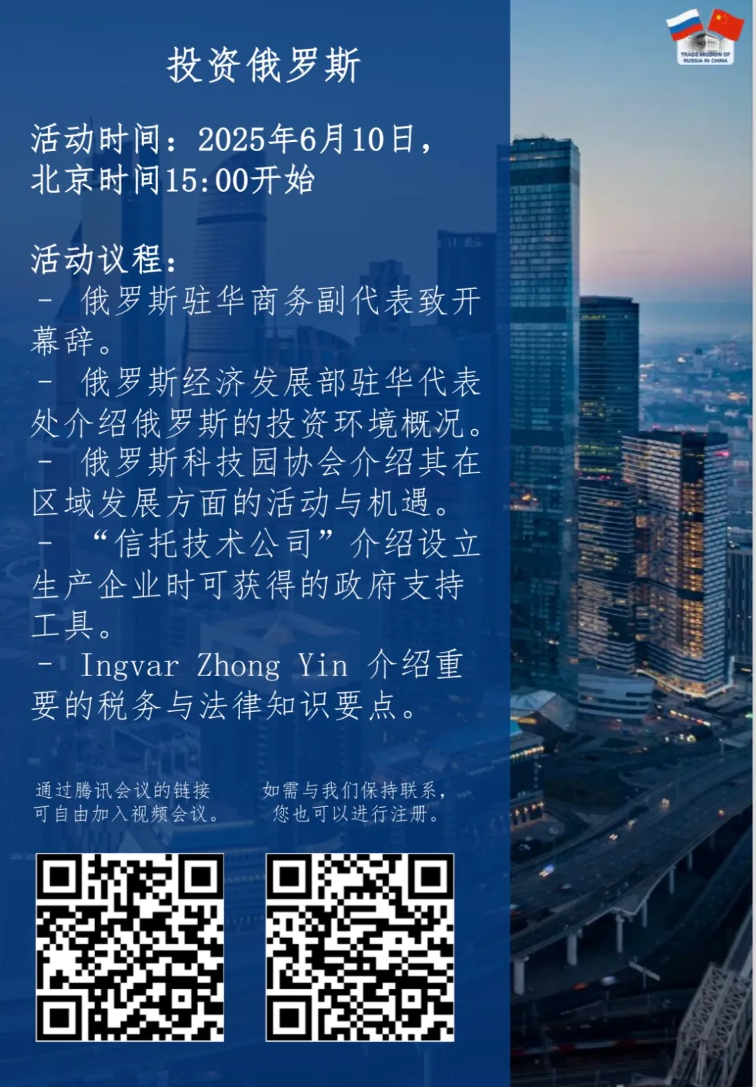 第二阶段(15:00—17:00):“投资俄罗斯”机遇与政策的官方解读分享